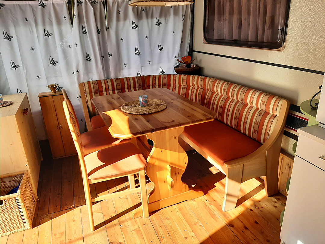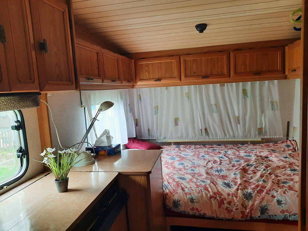 - Intérieur de la caravane aménagé avec deux lits double (140x200 cm)
