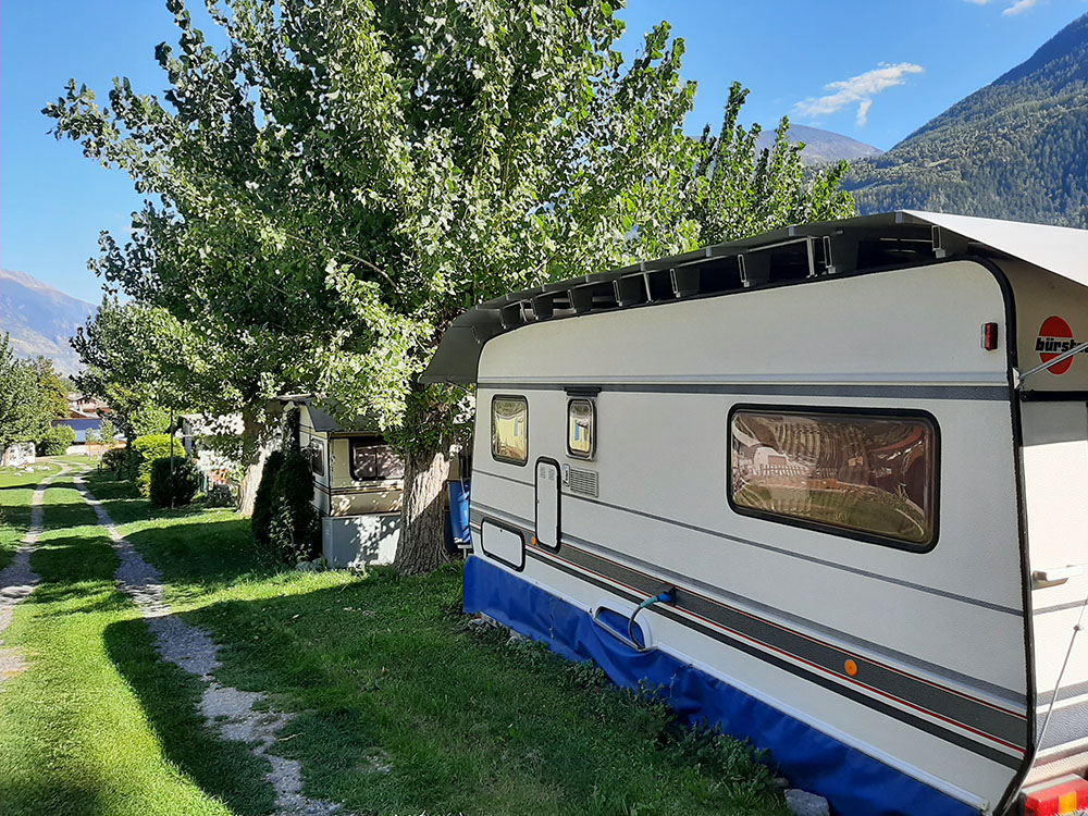 Belle caravane fixe Burstner City au Camping Torrent à Susten (campingtorrent.ch) (la Souste, commune de Loèche), dans un cadre magnifique sans vis-à-vis, et située près du Bois de Finges et des bains thermaux de Loèche-les-Bains et Brigerbad.